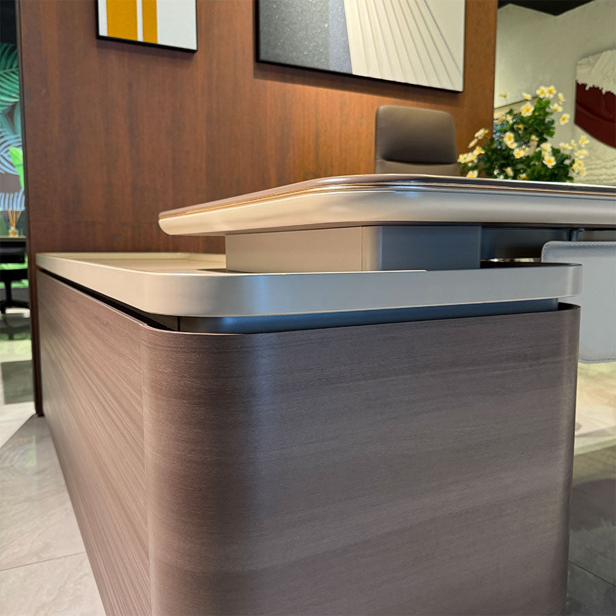 The AeroPrime Executive Desk combines sophisticated design with functional workspace solutions. Featuring a spacious work surface and sturdy construction, this desk accommodates multiple monitors and essential office equipment with ease. The clean lines and professional aesthetic complement any corporate environment, while the ergonomic layout supports productivity throughout the workday. Ideal for executives and professionals seeking a reliable desk that balances style with practical performance.